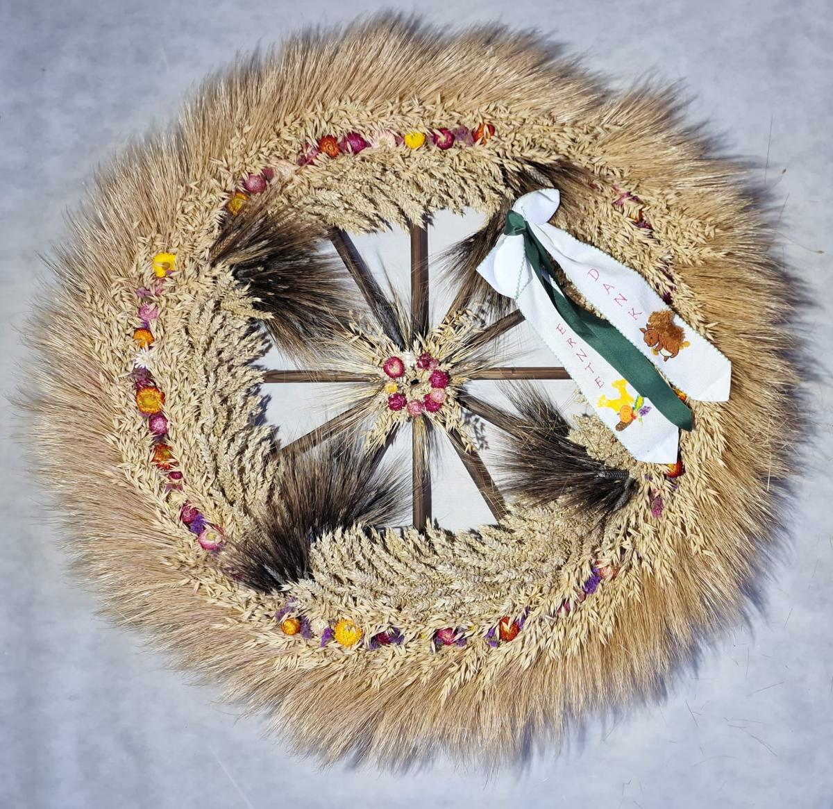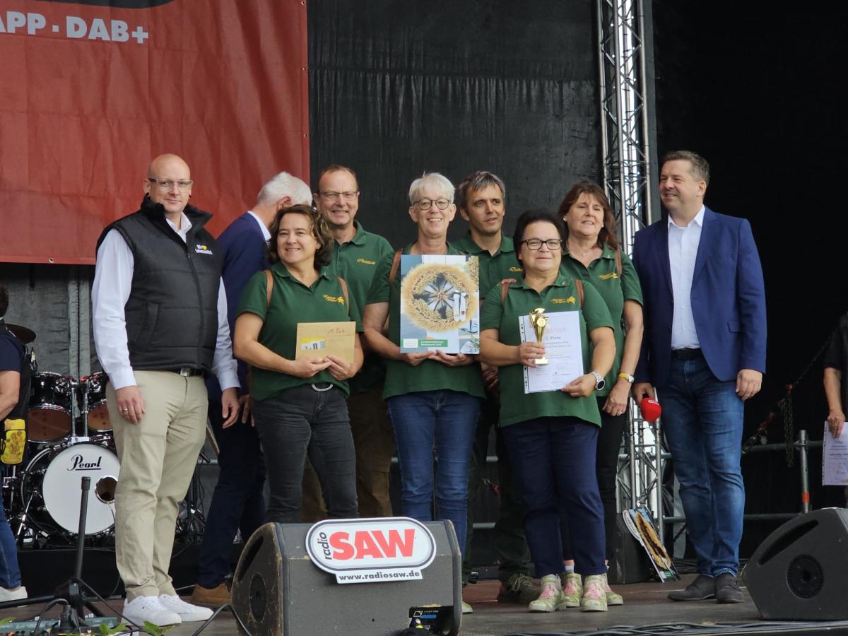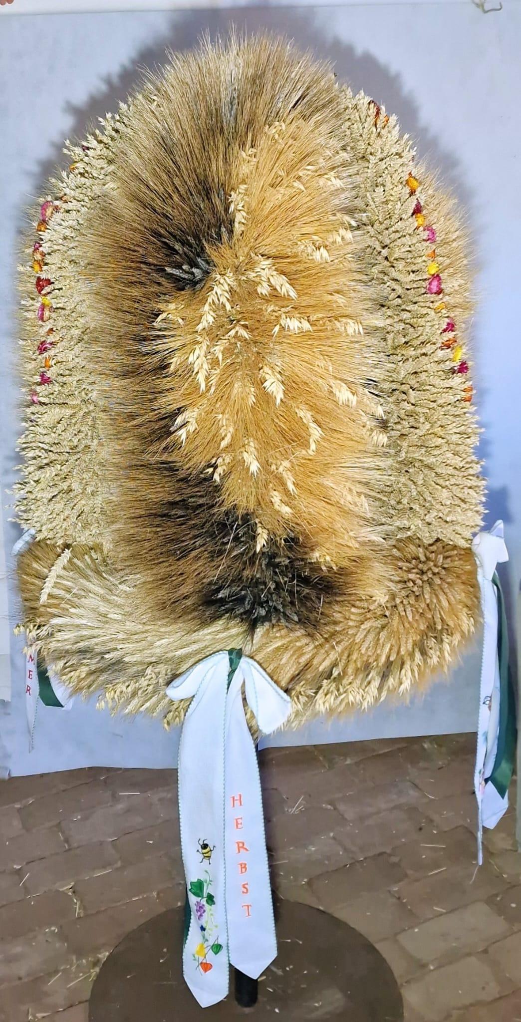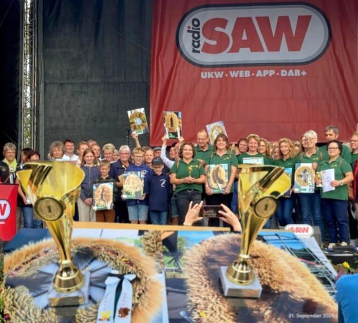 2022 nahmen wir zum ersten Mal am Erntekronenwettbewerb beim Landeserntedankfest in Magdeburg teil und landeten prompt auf Platz zwei. Unsere Krone aus dem Jahr 2024 schmückt den Magdeburger Dom.